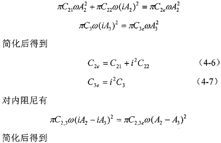 在圖4-3所示的動(dòng)力學(xué)模型中,出現(xiàn)了具有并聯(lián)結(jié)構(gòu)的傳動(dòng)分支,應(yīng)將其轉(zhuǎn)換為等效的串聯(lián)結(jié)構(gòu),以便應(yīng)用傳遞矩陣法建模和求解。對(duì)波發(fā)生器而言,扭轉(zhuǎn)剛度按式(4-9)計(jì)算。