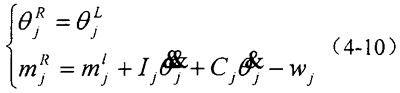 如圖4-6所示,第j個(gè)彈性元件的扭轉(zhuǎn)剛度為kj,扭轉(zhuǎn)阻尼為Cj,元件的左右兩側(cè)各連接一個(gè)慣性元件,左側(cè)慣性元件的右端狀態(tài)矢量等于彈性元件的左端狀態(tài)矢量,即θLj=θRj-1,mjL=mj-1R。右側(cè)慣性元件左端的狀態(tài)矢量等于彈性元件右端的狀態(tài)矢量,即θRj=θLj+1,mjR=mj+1L。彈性元件的內(nèi)力為彈性恢復(fù)力矩kj(θRj-θLj)和阻尼力矩Cj(θ&&j-θ&j)。根據(jù)力平衡關(guān)系可得