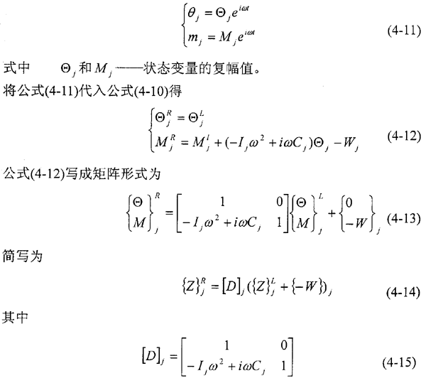 當(dāng)元件數(shù)學(xué)模型建立后,尤其是得到各個(gè)元件的傳遞矩陣后,根據(jù)傳遞扭矩法就可行到整個(gè)系統(tǒng)的數(shù)學(xué)模型。假設(shè)整個(gè)系統(tǒng)共有n個(gè)元件,則根據(jù)上述原理,可以逐步計(jì)算各個(gè)元件兩端的狀態(tài)矢量。