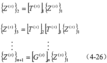當(dāng)不計(jì)阻尼時(shí),慣性元件的傳遞矩陣是系統(tǒng)振動(dòng)頻率的平方ω2的函數(shù),彈性元件的傳遞矩陣僅與元件的剛度有關(guān),所以系統(tǒng)累積傳遞矩陣的元素G22是ω2的函數(shù),并且ω2的階次與系統(tǒng)的慣性元件數(shù)目相同,所以滿足式(4-25)的振動(dòng)頻率均為系統(tǒng)的固有頻率。