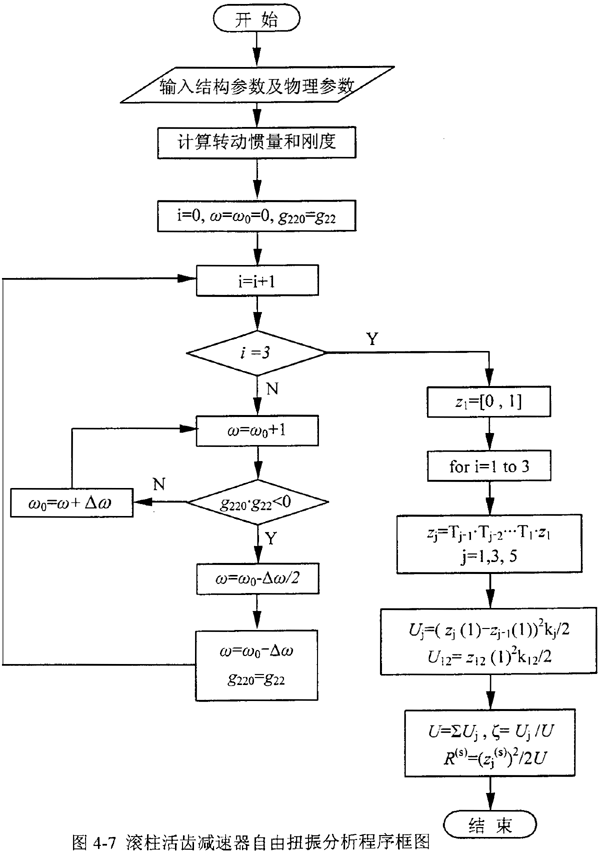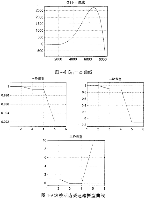 根據(jù)前面介紹的方法,在計(jì)算機(jī)上編程對(duì)減速器的扭振動(dòng)力學(xué)特性進(jìn)行分析,其程序框圖見圖4-7所示。在計(jì)算機(jī)上運(yùn)算時(shí),按照確定的頻率步長(zhǎng)對(duì)頻率方程掃頻,作出“G11-ω”曲線,如圖4-8所示,凡G22=0時(shí)的ω值,就是系統(tǒng)的固有頻率。有關(guān)固有頻率、勢(shì)能分布率和模態(tài)柔度的計(jì)算結(jié)果見表4-2。另外,利用該程序還繪制出圖4-9所示的減速器系統(tǒng)的振型曲線。