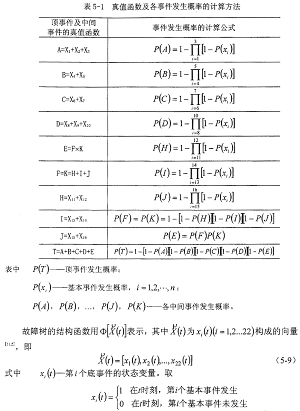 故障樹(shù)的定量分析是運(yùn)用故障樹(shù)邏輯圖,根據(jù)基本事件發(fā)生的概率求出頂事件發(fā)生的概率,從而對(duì)系統(tǒng)的可靠性、安全性作出評(píng)價(jià)。故障樹(shù)中各種事件間的因果關(guān)系用各種“門(mén)”來(lái)描述。其它邏輯門(mén),大多可以轉(zhuǎn)化為等效的邏輯“與門(mén)”和“或門(mén)”。根據(jù)“與門(mén)”和“或門(mén)”所表示的事件關(guān)系,并假設(shè)各個(gè)事件互相獨(dú)立,根據(jù)表5-1即可計(jì)算活齒減速器中各中間事件和頂事件的發(fā)生概率。