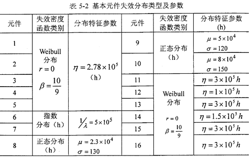 根據(jù)據(jù)第三章所設(shè)計(jì)的減速器及本章建立的故障樹(shù)對(duì)減速器進(jìn)行可靠性的計(jì)算機(jī)仿真研究。其各基本元件壽命分布參數(shù)見(jiàn)表5-2,采用上述算法編程求解。