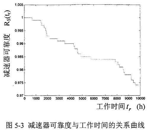 通掃故障樹(shù)2000次,產(chǎn)生減速器壽命抽樣值2000個(gè),設(shè)系統(tǒng)最大工作時(shí)間Tmax為1000h,考察減速器在工作8760h的可靠度。將Tmax分為1000個(gè)區(qū)間,統(tǒng)計(jì)減速器壽命抽樣落入各區(qū)間的次數(shù),得到減速器可靠度的仿真值與工作時(shí)間的關(guān)系曲線如圖5-3所示。由式(5-13)~(5-20)求得減速器的其他可靠性指標(biāo)如表5-3和表5-4所示。