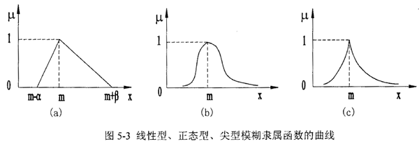 線性型參照函數(shù)在“完全屬于”和“完全不屬于”之間的中介狀態(tài)是線性變化的(見(jiàn)圖5-3a),當(dāng)x≤m-α和x≥m+β時(shí),μ=0,說(shuō)明在(m-α, m+β)區(qū)間之外的數(shù)值完全不屬于該模數(shù)數(shù),而其他類型的隸屬函數(shù)曲線兩端延伸到無(wú)窮遠(yuǎn)(圖5-3b,c),說(shuō)明整流器個(gè)數(shù)軸上的任何數(shù)總在一定程度上隸屬于該模數(shù)數(shù)。在選擇參照函數(shù)時(shí),除非有絕對(duì)的擾握認(rèn)為該事件發(fā)生的概率在某個(gè)范圍之間而選擇線性參照函數(shù),否則,以選取正態(tài)型或尖型為好。