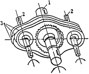 三環(huán)減速器是一種利用三相并列雙曲柄機(jī)構(gòu)來克服死點(diǎn)的連桿內(nèi)齒行星齒輪減速器,其基本結(jié)構(gòu)如圖5-0所示。它由低速輸出軸1 ,兩根高速輸入軸2 ,三片傳動(dòng)齒板3組成,各軸均平行配置,相同的兩根高速軸帶動(dòng)三片傳動(dòng)齒板呈120°相位差作平面轉(zhuǎn)動(dòng),傳動(dòng)環(huán)板上的內(nèi)齒圈與低速軸上的外齒輪相嚙合,形成大速比,其傳動(dòng)比