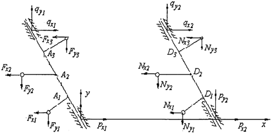 式中(Nbx,Nby)、(Ncx,Ncy):連桿兩端B、C的作用反力沿x軸、y軸的分量。