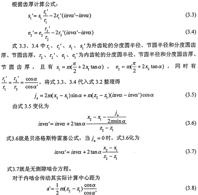 當(dāng)齒輪傳動(dòng)的幾何設(shè)計(jì)參數(shù)確定后,影響實(shí)際傳動(dòng)的就只有制造和安裝誤差,對于中心距a′而言,影響它的因素是制造誤差、安裝誤差,而不是齒側(cè)間隙jn與齒輪變位系數(shù)X2-X1。齒輪設(shè)計(jì)是按無側(cè)隙進(jìn)行的,同時(shí)不考慮制造、安裝誤差,但加工時(shí),齒輪齒厚公差都是負(fù)偏差,即齒輪厚公差都是負(fù)偏差,即齒輪必須減薄,這樣實(shí)際傳動(dòng)存在齒側(cè)隙。如果不考慮中心距的誤差,由式3.6的第3種形式可知,齒側(cè)隙的變化必然影響到齒輪變位系數(shù)的變化。顯然,這樣的變化也就會(huì)使齒輪的齒頂圓產(chǎn)生變化,相應(yīng)的齒頂圓奢力角產(chǎn)生變化,進(jìn)而影響齒輪嚙合重合度。