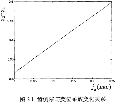 由3.2圖可以看出,當(dāng)齒側(cè)隙jn由0變化至.25毫米時(shí)(查資料取較大最小側(cè)隙參考值),齒輪變位系數(shù)差X2-X1的變化量由近0.32變化到0.50,變化了約0.18。