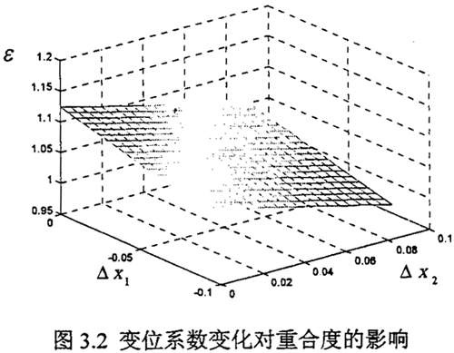 由式3.10、3.11可以看出,當(dāng)總變位系數(shù)xΣ=x2-x1產(chǎn)生變化時(shí),必然引起起嚙合齒輪齒頂圓直徑的變化。按X1、X2變化最小原則,有三種可能性,即X1不變,X2變化0~0.18;或X1變化0~0.18,X2不變;或X1變小,X2變大,變化范圍0~0.09。假定齒輪嚙合角不變,按本文實(shí)驗(yàn)樣機(jī)參數(shù),當(dāng)齒輪變位系數(shù)發(fā)生變化時(shí),其變化量對重合度的影響狀況見圖3.2所示。從圖3.2所示可以看出,隨外齒輪變位變小時(shí),齒輪嚙合重合度減小,隨內(nèi)齒輪變位變小時(shí),齒輪嚙合重合度增大,從圖中的變化趨勢為看,外齒輪變位系數(shù)的變化對重合度的影響程度與內(nèi)齒輪變位系數(shù)的變化對重合度的影響程度大約是相同的,只是趨向是反向的。