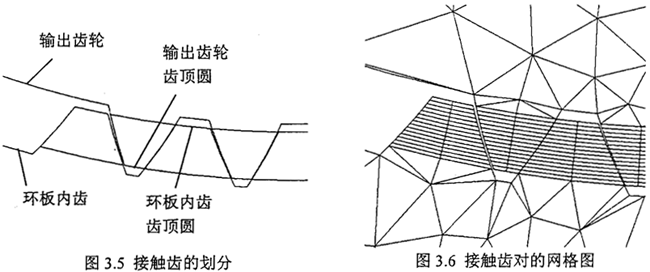 環(huán)板內(nèi)齒輪與輸出軸齒輪之間的傳動(dòng)是直齒輪傳動(dòng),為保證進(jìn)行接觸計(jì)算時(shí),有較多的有較接觸區(qū)域,齒輪輪齒部分的有限元網(wǎng)格采用映射網(wǎng)格劃分法(Mapped Meshing)對齒輪進(jìn)行有限元網(wǎng)格劃分。同時(shí),為保證兩對嚙合齒輪所劃分的網(wǎng)格接觸對相應(yīng)的面能對應(yīng)齊,因此齒輪嚙合的接觸面相應(yīng)應(yīng)當(dāng)齊整。用輸出軸齒輪的齒頂面所在的輪廓曲面對環(huán)板內(nèi)齒進(jìn)行劃分(partition 命令),同理用環(huán)板內(nèi)齒的齒頂面所在的輪廓曲面對輸出軸齒輪進(jìn)行劃分,這樣得到對應(yīng)齊整的齒輪嚙合的接觸面,如圖3.5所示。根據(jù)圖3.5所示,采用映射網(wǎng)格劃分法( Mapped Meshing)進(jìn)行網(wǎng)格劃分的輪齒部分即是圖中輸出齒輪齒頂圓與環(huán)板內(nèi)齒齒頂圓之間所劃分的部分,而其余部分采用自由網(wǎng)格劃分法(Free Meshing)進(jìn)行劃分,劃分網(wǎng)格后的部分網(wǎng)格圖見圖3.6所示?紤]實(shí)際接觸齒對數(shù)不會(huì)太多,所以每塊環(huán)板上只給出6個(gè)輪齒進(jìn)行接觸計(jì)算。環(huán)板嚙合的實(shí)際過程是環(huán)板齒輪帶動(dòng)輸出齒輪運(yùn)動(dòng),計(jì)算時(shí)為方便,假設(shè)環(huán)板固定不動(dòng),設(shè)定輸出軸繞軸線轉(zhuǎn)動(dòng),將減速器的輸出功率換算為輸出扭矩,加在輸出軸的輸出端。
