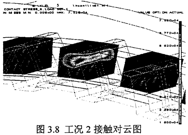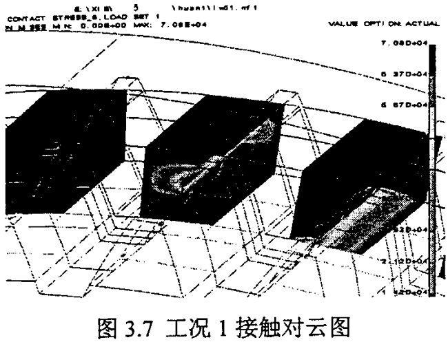 工況六至工況十這四和情況,是指兩環(huán)板之間不對稱,即偏心軸的兩個(gè)偏心拐的尺寸誤差不一致,這里考慮的是特殊狀況,從表3.10-3.13看出,當(dāng)兩環(huán)板不對稱時(shí),將產(chǎn)生嚴(yán)重的載荷不均現(xiàn)象,載荷偏向中心距小的環(huán)板內(nèi)齒上,甚至只有一個(gè)環(huán)板承受載荷。由此說明,對于雙環(huán)減速器偏心軸有加工,應(yīng)特別注意兩曲捌的制造誤差,應(yīng)盡量使安裝好的兩環(huán)板具有較好的對稱性。圖3.7~圖3.12為六種工況下環(huán)板內(nèi)齒的接觸齒對的應(yīng)力云圖。