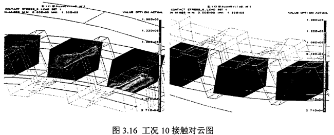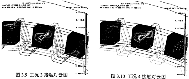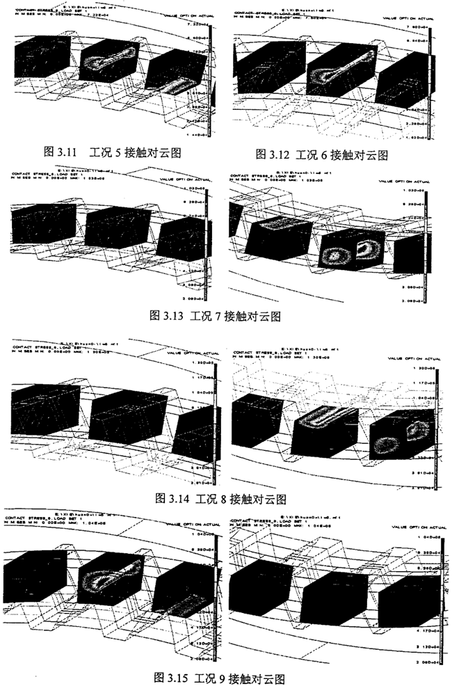 由表3.2~3.13可以看出,無論有無制造、安裝誤差的影響,隨著負(fù)荷的增加,齒輪實(shí)際嚙合接觸對數(shù)增加,但從計(jì)算結(jié)果分析證明,負(fù)荷對接觸對的影響小于誤差對接觸對的影響。對比表中的接觸對數(shù)和接觸應(yīng)力,數(shù)據(jù)表明當(dāng)齒厚發(fā)生變化時(shí),實(shí)際接觸齒對數(shù)變化比較大,同時(shí)最大接觸應(yīng)力也有明顯變化。從變化的趨勢上看出與前面的理論推導(dǎo)變化趨勢相同,這里只是更加明顯。