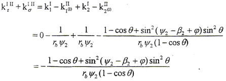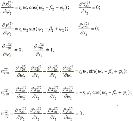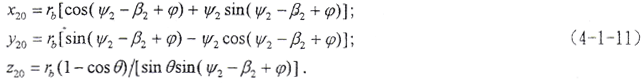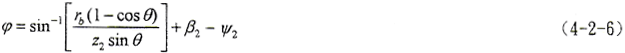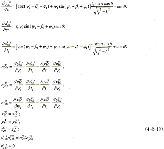 (4-1-9)式中,φ1、φ2為二齒面的轉(zhuǎn)角,令φ1=φ2=φ,將(4-1-2)式及由(4-1-8)式解出的t2代入(4-1-9)式,即可得到以ψ2、φ為參變量的外齒輪齒面方程。