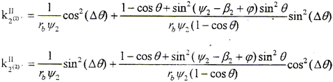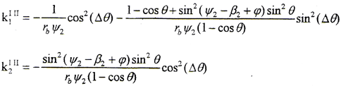 在齒高方向,由于k2Ⅰ與ψ1和t1有關(guān),是否存在在曲率干涉,需進(jìn)行計(jì)算才能確定。在齒寬中截面上,k2Ⅰ=1/(rbψ1),由于內(nèi)外齒輪存在軸間傾角θ,由Eular公式可計(jì)算出與k2Ⅱ同方向的外齒輪齒面法曲率,k2Ⅰ′=cos2θ/(rbψ1)。由接觸點(diǎn)計(jì)算知,在齒寬中截面上的接觸點(diǎn)ψ1=ψ2,因此存在k2Ⅰ′<k2Ⅱ,即說明存在曲率干涉,且θ越大,曲率干涉越嚴(yán)重。