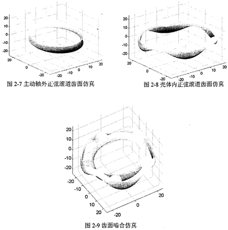 采用Matlab工程軟件對圓柱正弦活齒傳動進行齒面仿真的研究。為仿真出三維曲面,在接觸線上劃分100個單元,在齒面圓周方向劃分1001個單元,由此將齒廓曲而劃分為100×1001的網(wǎng)格。根據(jù)數(shù)學模型計算出各個網(wǎng)格節(jié)點對應的數(shù)值,得到齒廓曲面的網(wǎng)格圖,然后采用二維線性插值的方法,得到整個齒廓的曲面仿真及齒面嚙合偏真如圖2-7~圖2-9所示。