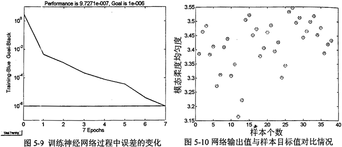 進(jìn)行動(dòng)態(tài)優(yōu)化時(shí),若要建立起目標(biāo)函數(shù),首先要獲得一組能夠精確計(jì)算f4(x)的權(quán)值,這就需要通過(guò)樣本訓(xùn)練BP神經(jīng)網(wǎng)絡(luò),當(dāng)誤差精度達(dá)到要求時(shí),訓(xùn)練停止,并得到了該組權(quán)值,利用該組權(quán)值與設(shè)計(jì)變量通過(guò)三層BP網(wǎng)絡(luò)可以計(jì)算出訓(xùn)練后的分目標(biāo)函數(shù)值f4(x)。在訓(xùn)練神經(jīng)網(wǎng)絡(luò)時(shí),學(xué)習(xí)速率取為0.01,動(dòng)量常數(shù)取為0.9,目標(biāo)誤差取為l×10-16。當(dāng)訓(xùn)練結(jié)束時(shí),網(wǎng)絡(luò)輸出值與樣本目標(biāo)值之間的誤差均方根值為8.8386×l0-17(見圖5-7),訓(xùn)練過(guò)程誤差的變化情況及訓(xùn)練完成后網(wǎng)絡(luò)輸出值與樣本目標(biāo)值對(duì)比情況如圖5-8所示。