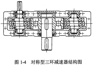 盡管我國在三環(huán)減速器的研究方面取得了許多令人矚目的成果,但由于三環(huán)減速器的研發(fā)時間較短,對有些問題研究的還不夠深入,生產(chǎn)中存在的一些實際問題還未從根本上得到解決,制約了這種新裝置的推廣使用。我國開發(fā)的三環(huán)減速器的基本型結(jié)構(gòu)主要有兩種,一是兩高速軸對稱布置于輸出軸兩側(cè)的對稱型三環(huán)減速器,如圖1-4所示,另一種是兩高速軸布置于輸出軸同側(cè)的偏置型三環(huán)減速器。
