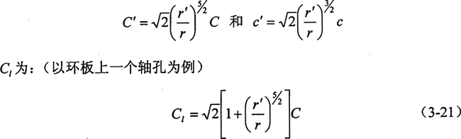 上式是按滑動(dòng)軸承理論進(jìn)行的,與我們設(shè)計(jì)的油膜浮動(dòng)裝置有重要區(qū)別。我們設(shè)計(jì)的油膜浮動(dòng)均載方案,共有兩層油膜,即:偏心套與浮環(huán)、浮環(huán)與滾動(dòng)軸承之間各形成一層共轉(zhuǎn)滑動(dòng)軸承油膜,設(shè)浮環(huán)內(nèi)外半徑為r、r′,c、c′為浮環(huán)的內(nèi)外半徑間隙,C1為環(huán)板的浮動(dòng)量,由摩擦學(xué)理論可導(dǎo)出共轉(zhuǎn)軸承的浮動(dòng)量C′和半徑間隙c′與普通滑動(dòng)軸承的浮動(dòng)量C和半徑間隙c之間的關(guān)系下: