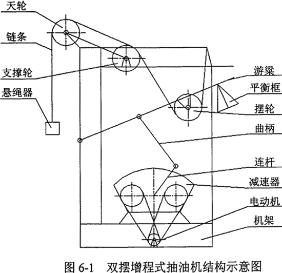 雙擺增程式抽油機(jī)的結(jié)構(gòu)如圖6-1所示。其工作原理為:電機(jī)的高速旋轉(zhuǎn)運(yùn)動,通過兩級三環(huán)減速器、四連桿機(jī)構(gòu)轉(zhuǎn)變成游梁的往復(fù)擺動,游梁上的擺輪隨游梁一起擺動,再通過鏈條纏繞滑輪組傳動并帶動光桿上下運(yùn)動,實(shí)現(xiàn)抽油過程。該機(jī)是利用鏈條行程是擺輪行程兩倍的原理,實(shí)現(xiàn)增程的。