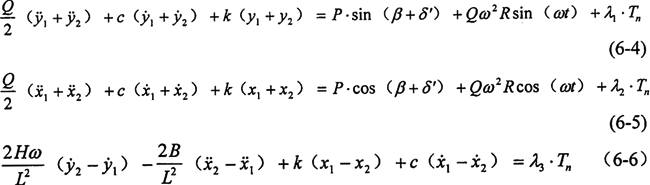 設(shè):彈性支撐的剛度和阻礙尼分別為k和c,輸出軸與曲柄和平衡塊構(gòu)成的轉(zhuǎn)子的主中心軸慣性矩為H,赤道慣性矩為B,質(zhì)量為Q,R為中心對回轉(zhuǎn)軸線的偏心距,L中心到支撐點(diǎn)的距離,左右彈性支撐上相應(yīng)兩點(diǎn)的坐標(biāo)分別為y1,x1和y2,x2。λ1,λ2,λ3,λ4為載荷分配不均勻的影響系數(shù),可由均載試驗(yàn)的結(jié)果或力平衡方程求得,若均載效果好,均載系數(shù)接近1,λ1,λ2,λ3,λ4的值近似為0。