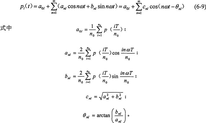 方程右端的激勵(lì)精圖治振力是復(fù)雜周期函數(shù),依據(jù)傅里葉級數(shù)展開原量,可將非簡諧的周期性激振力展成多個(gè)頻率成整倍數(shù)關(guān)系的簡諧激振力函數(shù)之和。由前面分析知,連桿力分力、慣性力和曲柄軸扭矩均為曲柄轉(zhuǎn)角的函數(shù),由于曲柄軸轉(zhuǎn)速恒定,故,激振力為時(shí)間的函數(shù),設(shè)為Pl(t),(l=1,2,3,4)其周期為T,考慮到激振力函數(shù)復(fù)雜且連桿力中的懸點(diǎn)載荷W難以用數(shù)學(xué)表達(dá)式描述,積分難以實(shí)現(xiàn),采用求和的方法求系數(shù)更為有效,以n0作為一個(gè)周期的等分區(qū)間數(shù)(一般取n0=36),時(shí)間區(qū)間為△t=T/n0,則它的傅里葉級數(shù)為: