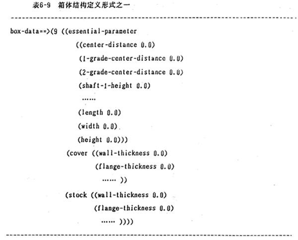 在進行圖1-1、圖1-2-1、l-2-2、1-2-3種類的圓柱齒輪減速器設(shè)計時,箱體是種類最多,變化程度最大的部件,因此,不可能建立一種統(tǒng)一的模式。根據(jù)傳動方案的不同,箱體形狀會發(fā)生很大的變化,設(shè)計工作量極繁重。通過分析,本系統(tǒng)采用的方法是通過框架來表達箱體設(shè)計的大量知識,如表6-11所示的框架是圖1-2-2 中第9號箱體的結(jié)構(gòu)定義式。