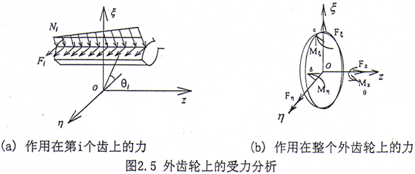 齒輪聯(lián)軸器上的受力是比較復(fù)雜的,對于外齒輪而言,除了與聯(lián)軸器連接的軸段對其的作用力外,還有內(nèi)齒套對外齒輪的作用力。轉(zhuǎn)子系統(tǒng)在運動過程中,內(nèi)外齒輪之間要發(fā)生相對運動,由于齒面間存在變形和摩擦,因此在外齒輪的齒面上會產(chǎn)生與齒面垂直的正壓力Ni和與齒面相切的摩擦力Fi,見圖2.5a。如果將各齒面上的作用力分別向外齒輪的中心O簡化可以得到作用于O點的一個力和一個力偶,并將該力和力偶分別分解到三個軸上,得到三個分力Fξ、Fη、Fz三個力偶矩Mξ、Mη、Mz,如圖2.5b所示。