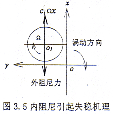 對于式(3.20)的穩(wěn)定性分析要復(fù)雜得多,形如式(3.14)的耗散函數(shù)首見于文獻(xiàn)[92]。美國學(xué)者Kane等在研究耗散的重力定向自旋衛(wèi)星穩(wěn)定性時(shí)發(fā)現(xiàn)的,與之相關(guān)的力被后來的學(xué)者稱之為約束阻尼,并沿用至今,而在轉(zhuǎn)子動力學(xué)中則多被稱為循環(huán)力[93].如果在系統(tǒng)運(yùn)動方程中沒有循環(huán)力陣[S],則系統(tǒng)的穩(wěn)定性可以利用著名的Kelvin-Tait-Chetaev定理來分析,但是當(dāng)[S]≠0時(shí),這個(gè)定理就不適用了。Mingori[94]、李俊峰等[95]對此作了專門的研究,給出了在某些特定條件下的判穩(wěn)方法。文獻(xiàn)[94]仍要求解一同階矩陣的特征值;而文獻(xiàn)[95]中的條件則要求det[G]≠0,因而式(3.20)不滿足,比較可行的方法是運(yùn)用Routh-Hurwitz法來判穩(wěn),但也只能解決低階系統(tǒng),對于高階系統(tǒng)只能進(jìn)行數(shù)值計(jì)算。一個(gè)比較簡單的物理解釋是在式(3.16)和式(3.17)中,存在首促進(jìn)渦動的耦合力(clΩx)和耦合力矩(caΩφ)項(xiàng)。下面以耦合力(clΩx)為例來加以說明。設(shè)轉(zhuǎn)子的轉(zhuǎn)動方向和渦動方向如圖3.5所示,耦合力與軸的轉(zhuǎn)動方向相同,并且隨轉(zhuǎn)子轉(zhuǎn)動角速度Ω的增大而增大,在Ω高于某一極限值時(shí),這個(gè)耦合力會超過外阻尼使軸心產(chǎn)生一個(gè)與該力同向的加速度,這個(gè)加速度使軸心軌跡發(fā)散,即系統(tǒng)失穩(wěn)。