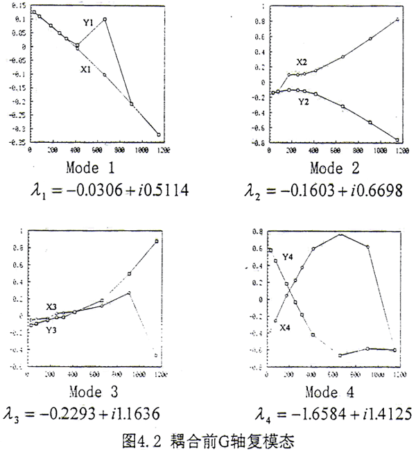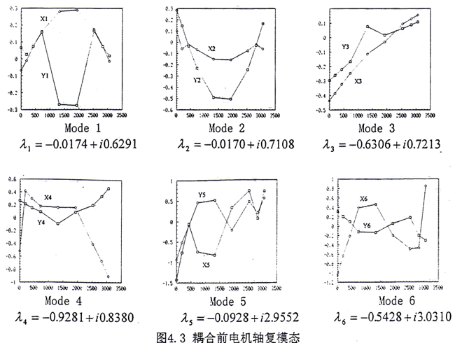 通過齒輪聯(lián)軸器耦合后的轉(zhuǎn)子系統(tǒng),在上述給定的轉(zhuǎn)速范圍內(nèi),共為12階模態(tài),如圖4.4所示,比耦合前多了2階。這表明耦合后在上述轉(zhuǎn)速范圍內(nèi)模態(tài)數(shù)目發(fā)生了變化。耦合系統(tǒng)的模態(tài)可以分為兩類:(1)第一類為耦合成分很小的振動,例如Mode1、Mode4、Mode7、Mode8,這4階幾乎完全表現(xiàn)為G軸的振動,電機軸的振動很小。但是從模態(tài)圖上來看又不能與耦合前單個G軸的4階模態(tài)相對應(yīng),主要表現(xiàn)為與齒輪聯(lián)軸器相連接的G軸的外伸端在耦合前上述4階的振動很大,而在耦合后振動受到很大的抑制,振動很小。從復(fù)特征值來看,無論是反應(yīng)系統(tǒng)衰減快慢的實部,還是反映系統(tǒng)自然振動頻率的虛部都有不小的變化。如果將上述4階對應(yīng)的復(fù)特征值作一比較,那么其中耦合后的虛部值總是大于耦合前的對應(yīng)值。其主要原因是在耦合后將G軸和電機軸作為一個整體系統(tǒng)來考慮,此時相當于將電機軸看作是對G的一個約束,這一約束直接作用于外伸端,使得G軸外伸端的振動減小,同時使得G軸的自然頻率增大。因此傳統(tǒng)上在計算DH機組的動態(tài)特性時,強行將G軸和電機軸分開,而只考慮其中的G軸,僅從這4階模態(tài)和復(fù)特征值上進行分析也會產(chǎn)生較大的偏差。(2)第二類為G軸和電機軸之間的耦合模態(tài),在這8階模態(tài)中G軸和電機軸的振動非常明顯,這表明如果將G軸和電機軸在齒輪聯(lián)軸器處分開處理,僅計算G軸的振動,而不考慮電機軸的影響,那么上述8階模態(tài)會全部被漏掉,因此這樣處理會丟失一些非常重要的低頻信息。在文獻[18]中,由于未考慮電機軸的作用,因此與電機軸有關(guān)的模態(tài)信息就不出現(xiàn)。如果從這8階復(fù)特征值前6階的數(shù)值來看,那么都能從耦合前電機軸的6階模態(tài)中找到,而且低階特征值的實部和虛部變化均不大。這說明如果僅分析電機軸的振動,那么將G軸忽略掉,倒能得到較好的近似。從直觀上看,將G軸與電機軸相比,其質(zhì)量和幾何參數(shù)要小許多。如果將G軸看成是電機軸的約束,那么這一約束比電機軸對G軸的約束自然要弱得多。因此從這一意義上來說G軸對電機軸的影響沒有電機軸對G軸的影響大。綜上所述,耦合后電機軸對G軸的影響較大,而G軸對電機軸的影響較小。在實際工程中,象DH這樣的機組曾發(fā)生電機振動過大的現(xiàn)象[9],因此如果不將G軸、電機軸和齒輪聯(lián)軸器作為整體一起進行分析而在齒輪聯(lián)軸器處強行分開只分析G軸的振動就顯得極不合適。