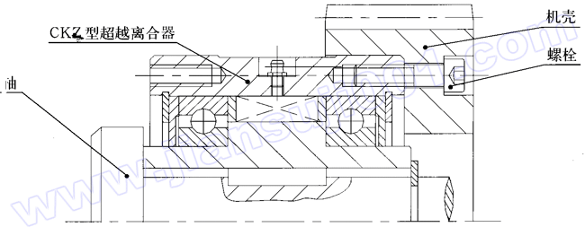 CKZ型為有軸承支撐的楔塊超越離合器。適用于極限轉(zhuǎn)速為600~1500r/min,常用公稱(chēng)轉(zhuǎn)矩為:180~8000N·m,常用于包裝機(jī)、起重運(yùn)輸機(jī)械、冶金機(jī)械、礦山機(jī)械、石油機(jī)械、化工機(jī)械、水泥機(jī)械、電站等,亦稱(chēng)逆止器。此型號(hào)主要用于逆轉(zhuǎn)及雙動(dòng)力源的慢速啟動(dòng)裝置。