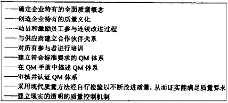 按ISO9000 族標(biāo)準(zhǔn)建立的QM體系以及與此有關(guān)的QM 手冊和為獲得QM 體系認(rèn)證提供有效的QM 體系的證明,都相互影響和支持著QM 方法。這樣,策略上的指導(dǎo)目標(biāo)及成功實施,在于使質(zhì)量管理確實成為在市場競爭中立于不敗之地的關(guān)鍵因素。